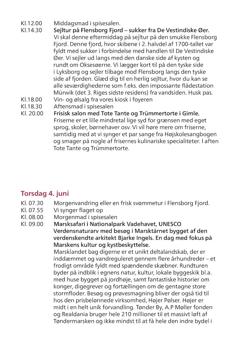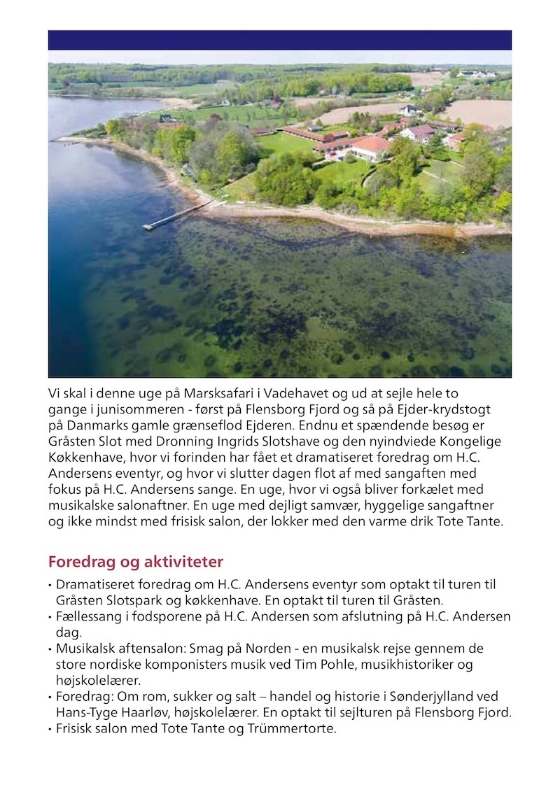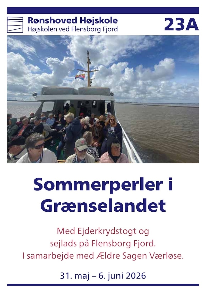 Vi har sammen med Højskolen udviklet et spændende program med flere dejlige ture, som fx et Ejder-krydstogt på Danmarks gamle grænseflod Ejderen, Marsksafari i Vadehavet og besøg på Gråsten Slot, gode og spændende foredrag med musik, gode fortællinger og meget mere.