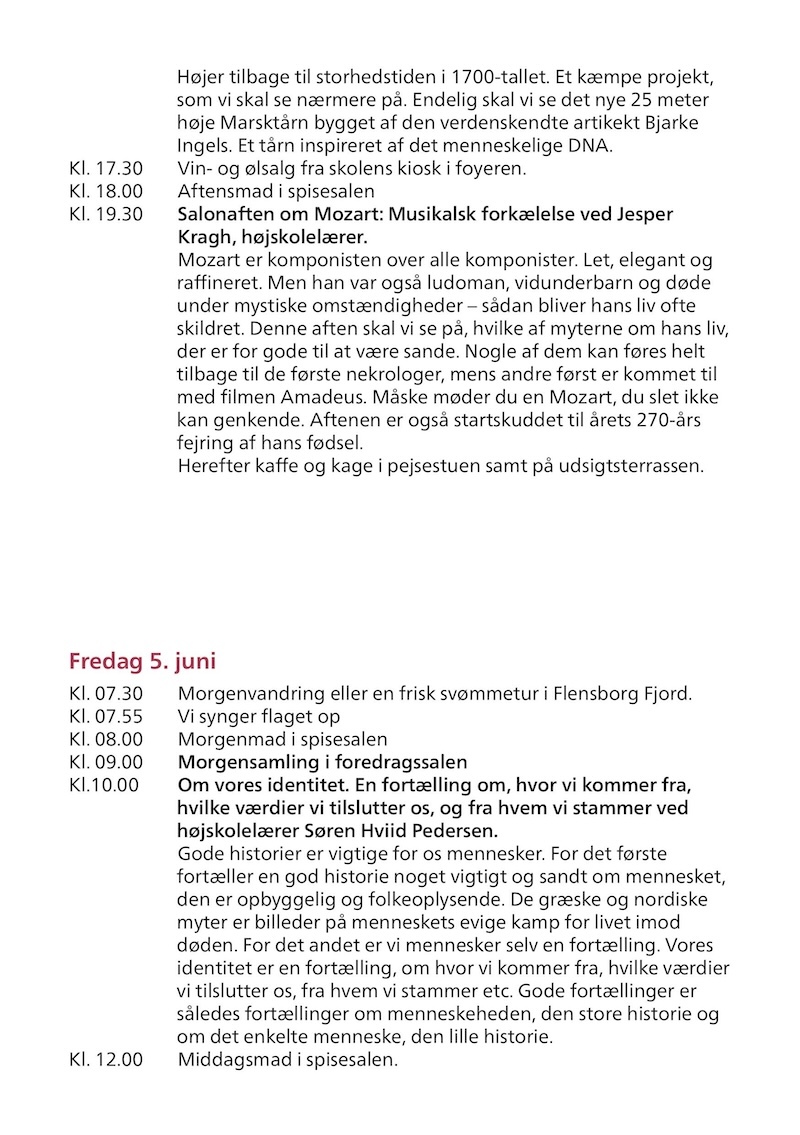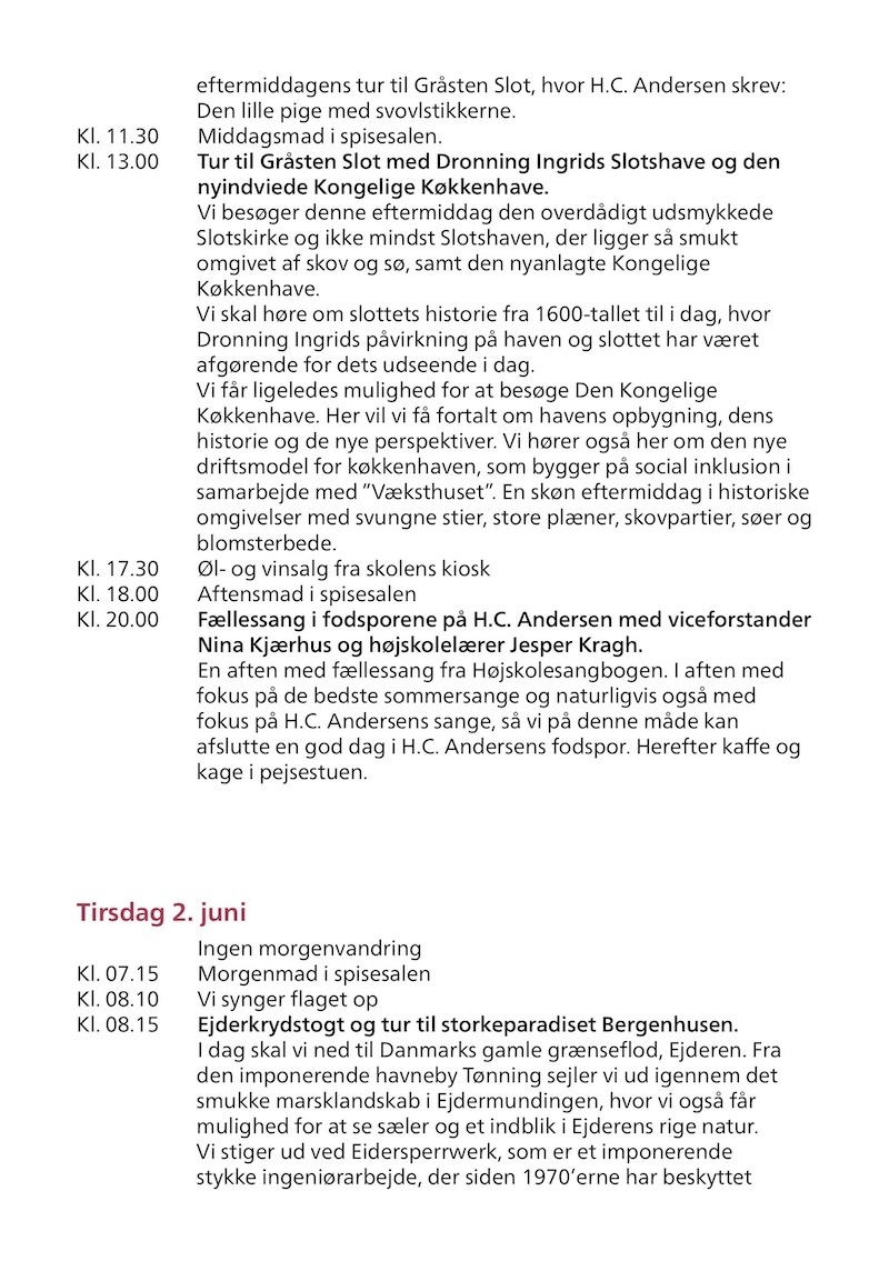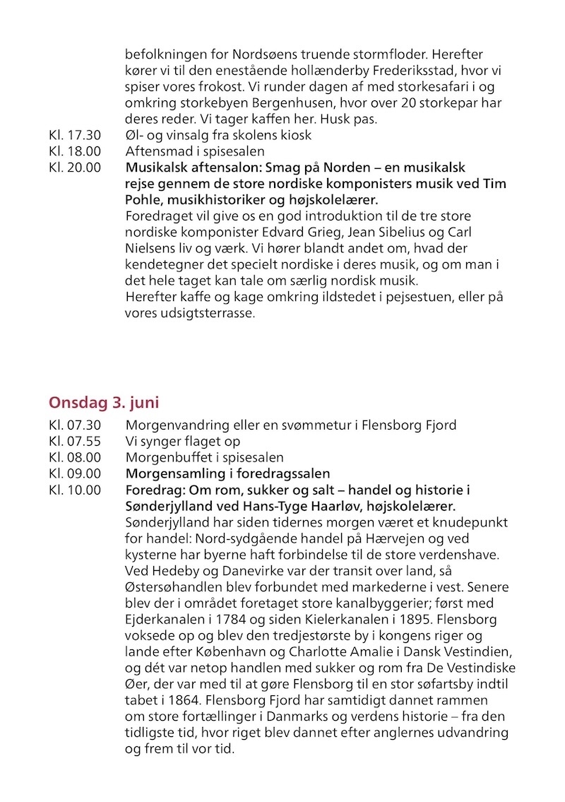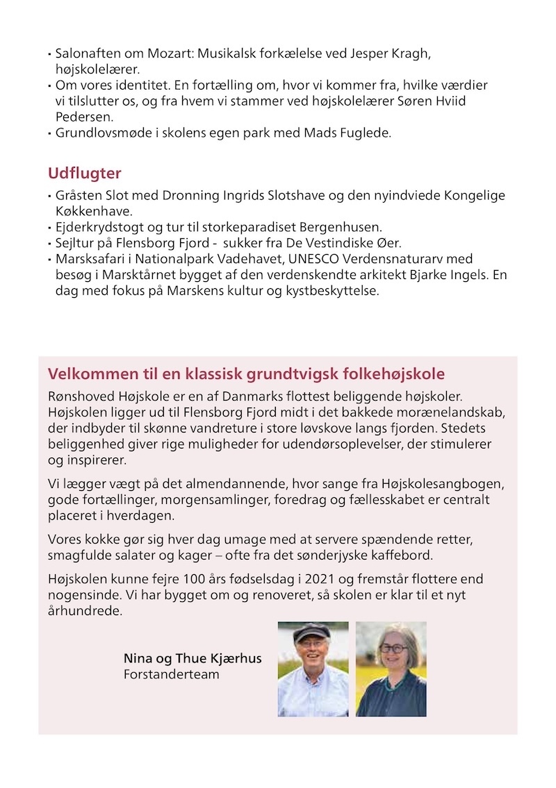 Vi har sammen med Højskolen udviklet et spændende program med flere dejlige ture, som fx et Ejder-krydstogt på Danmarks gamle grænseflod Ejderen, Marsksafari i Vadehavet og besøg på Gråsten Slot, gode og spændende foredrag med musik, gode fortællinger og meget mere.