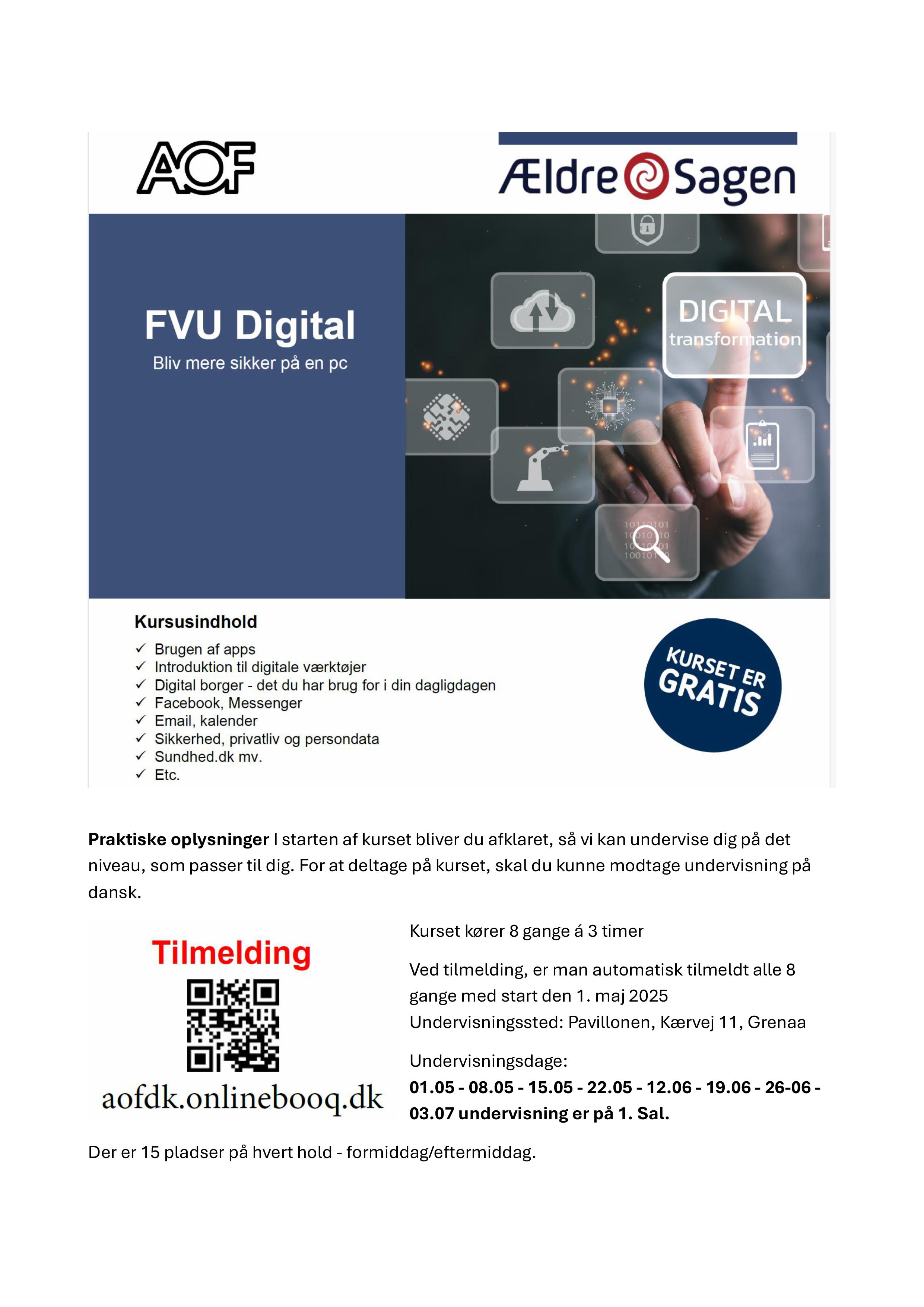 Husk tilmelding til både AOF og Ældre Sagen, Grenaa (tryk på den røde knap "tilmelding" på denne side).