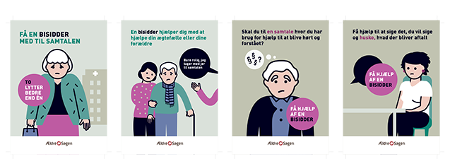 Vi har lavet materiale om bisiddere, der er henvendt til dem, som har brug for hjælp af en bisidder. Materialet består af en folder og fire postkort.
