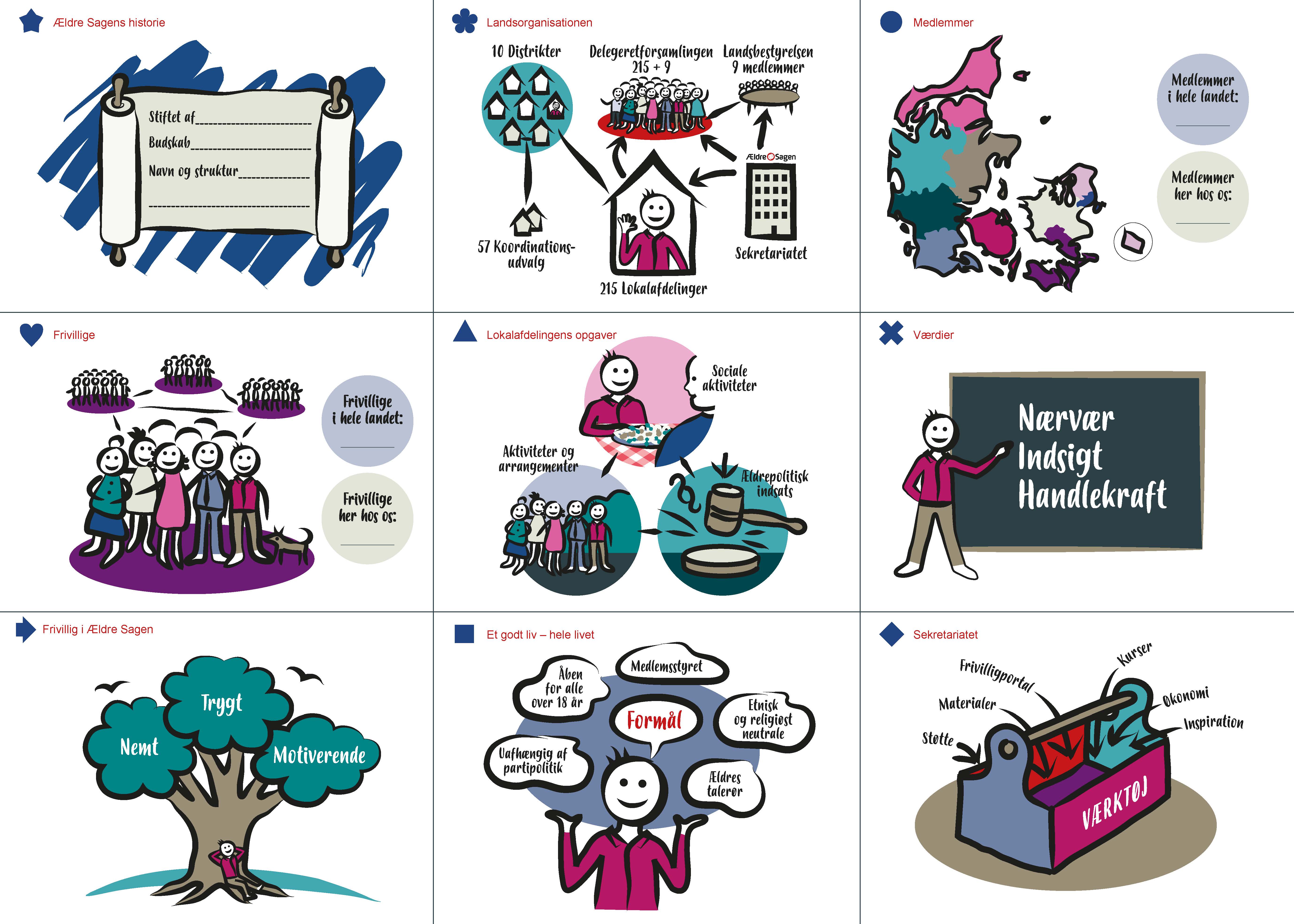 Plakaten viser 9 tegninger, som hver især giver mulighed for samtale om nogle emner, som er vigtige at kende noget til som ny frivillig i Ældre Sagen og i jeres lokalafdeling. Tegningerne kan give inspiration til jer og åbne op for at bringe temaer og emner i spil.
