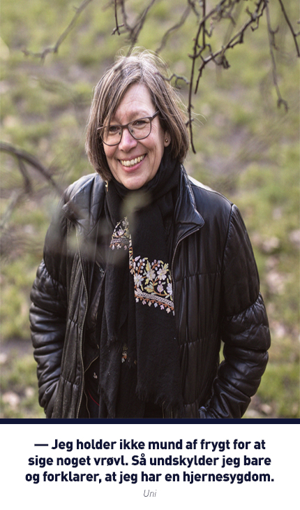 — Jeg holder ikke mund af frygt for at sige noget vrøvl. Så undskylder jeg bare og forklarer, at jeg har en hjernesygdom, fortæller hun.
