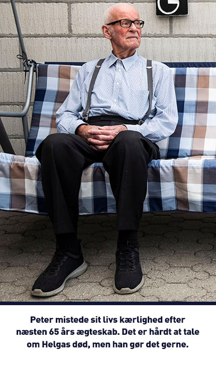 Tiden blev en mærkelig størrelse, og den blev brugt på sofaen med at stirre op i loftet, mens han tænkte over, hvordan han nogensinde skulle kunne finde ud af det uden hende. For Helga var ikke bare kærligheden i næsten 65 års ægteskab, hendes blide væsen var selve fundamentet i familien og for 88-årige Peter Hansen.