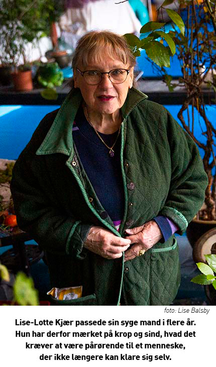 Pligterne var mange og dagene ofte lange for i dag 83-årige Lise-Lotte Kjær. I fire år passede hun sin mand, Kurt, i deres hjem i Skødstrup nord for Aarhus. Hun har derfor mærket på egen krop og eget sind, hvad det kræver at være pårørende til et menneske, der ikke længere kan klare sig selv.
