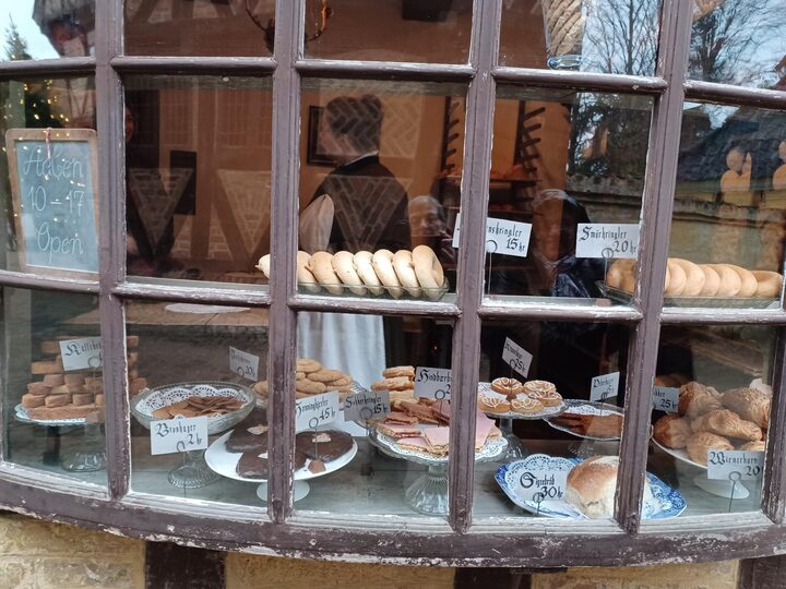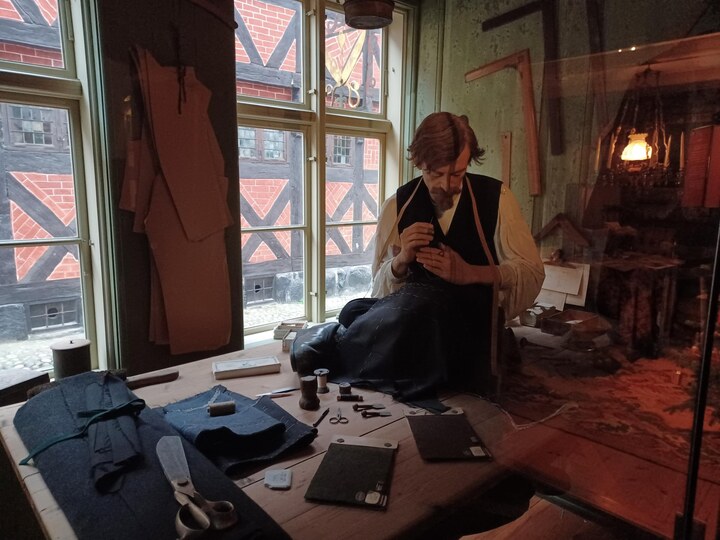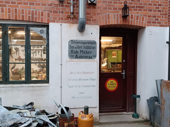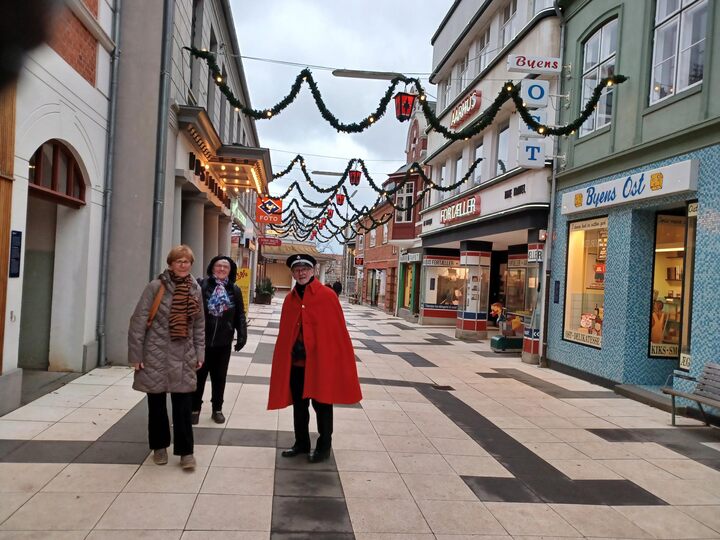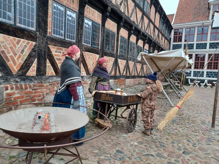 Her fik vi en fin fortælling om Byens opståen og hvilke huse som er blevet flyttet dertil. Fra Aabenraa er Bonnich konditori og Mutter Stahlboms hus, og blikkenslager Rich. Møkers værksted.