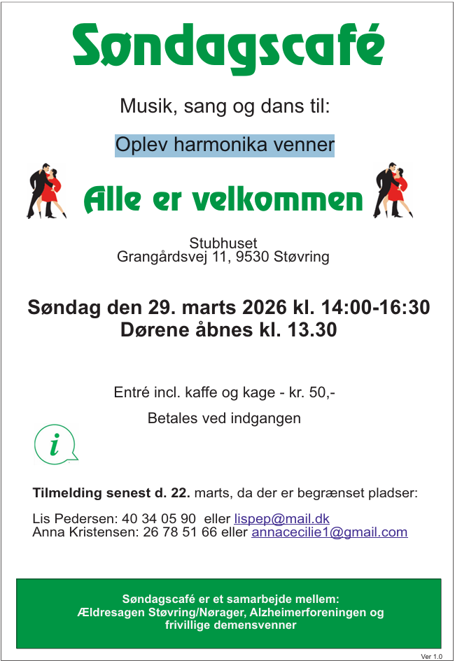 Musik, sang og dans med Oplev Harmonika Venner. Alle er velkomne. i samarbejde med Alzheimerforeningen og Frivillige Demensvenner.