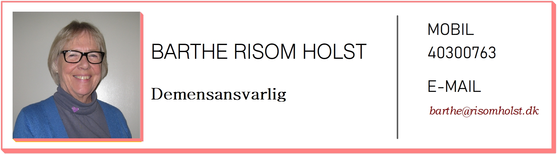 Alt det, vi har beskrevet ovenfor, har Barthe overblikket over, og hun kan hjælpe dig med at finde ud, hvor du skal gå hen med dine spørgsmål. Barthe har selv demens tæt inde på livet gennem flere år og øser gerne af sine egne erfaringer.