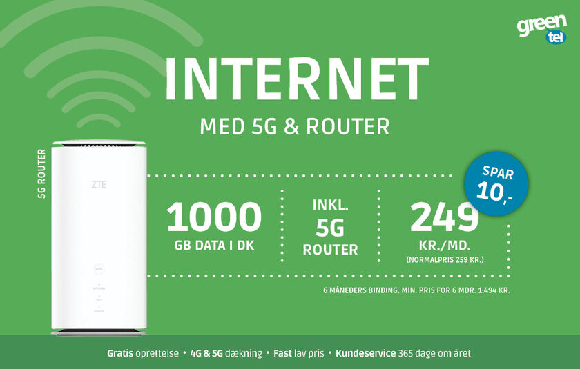 Hos Greentel kan du få en internet-løsning til fast lav pris. Du låner en router, hvor der er et simkort i, som du blot skal sætte i stikkontakten og stille den i et vindue - og så har du lynhurtigt 4G- og 5G-internet. Løsningen kaldes for mobilt bredbånd og kan anvendes både derhjemme, i sommerhuset og i campingvognen – kort sagt, du kan tage den med dig rundt.
