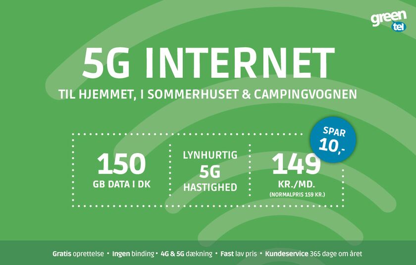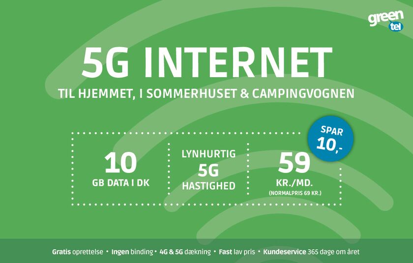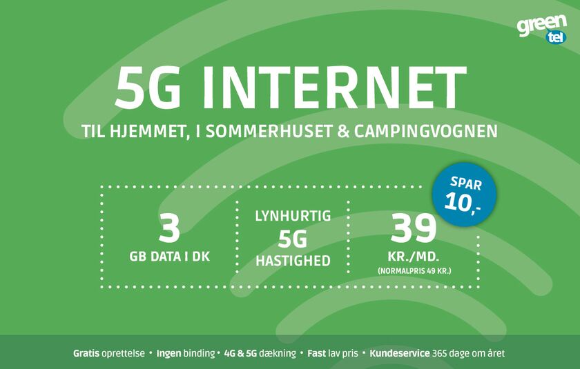 Hos Greentel kan du få 5G internet fra 39 kr./md. Der er ingen dyre installationer, du skal blot sætte et simkort i en router og så har du internet. Der er gratis oprettelse og ingen binding.