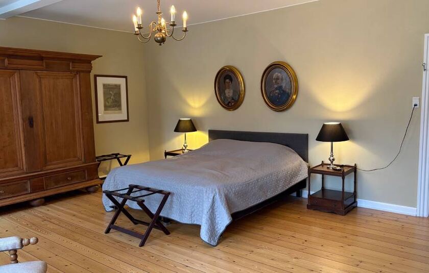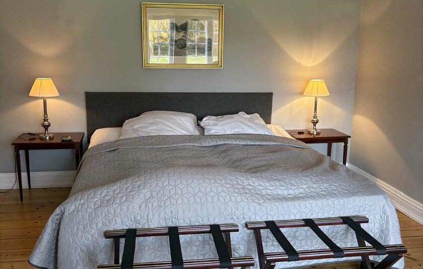 Som gæst bor du i unikke værelser på den historiske herregård og har adgang til stuer, have og de naturskønne omgivelser omkring huset. Hver morgen serveres morgenmad i Havestuen med udsigt til den store plæne og den fredelige stemning, der kendetegner stedet.