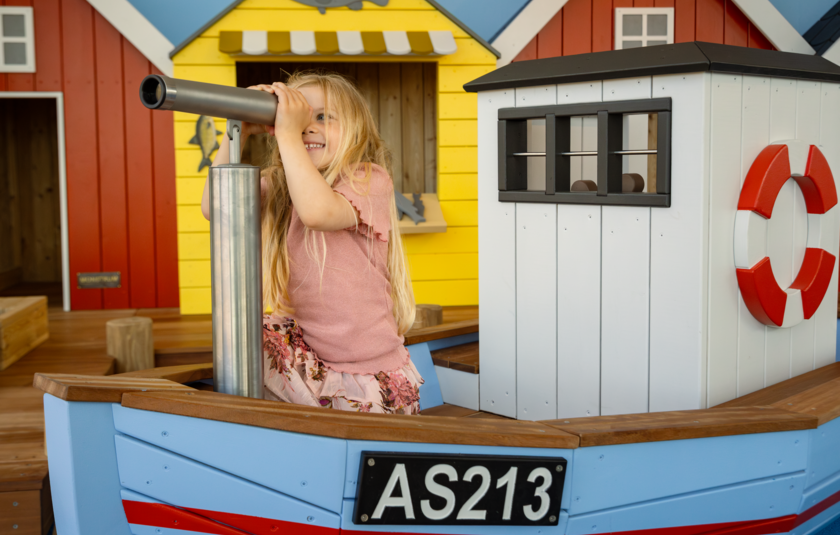 Lyseblå legekuttere står klar til familiens yngste, der sælger dagens fangst i deres egen lille fiskebutik. I rørebassinet kan små pilfingre røre en krabbe og mærke en haj, mens hele familien dykker ned i spændende, interaktive udstillinger. Udenfor fortsætter eventyret – med vandplask, sandkager i solen og store havdyr til gemmeleg!