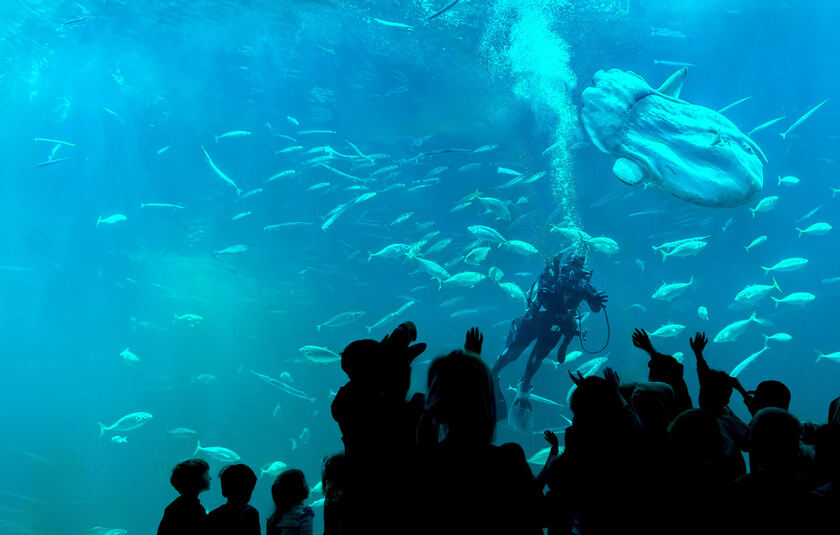 - Oplev dykkeren fodre hajer og klumpfisk i det gigantiske oceanarium.